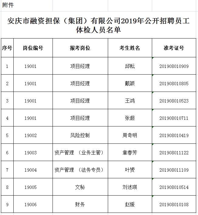 根據(jù)《2019年安慶市融資擔(dān)保(集團(tuán))有限公司公開招聘員工公告》有關(guān)規(guī)定,現(xiàn)將體檢、考察工作相關(guān)事宜予以公告: